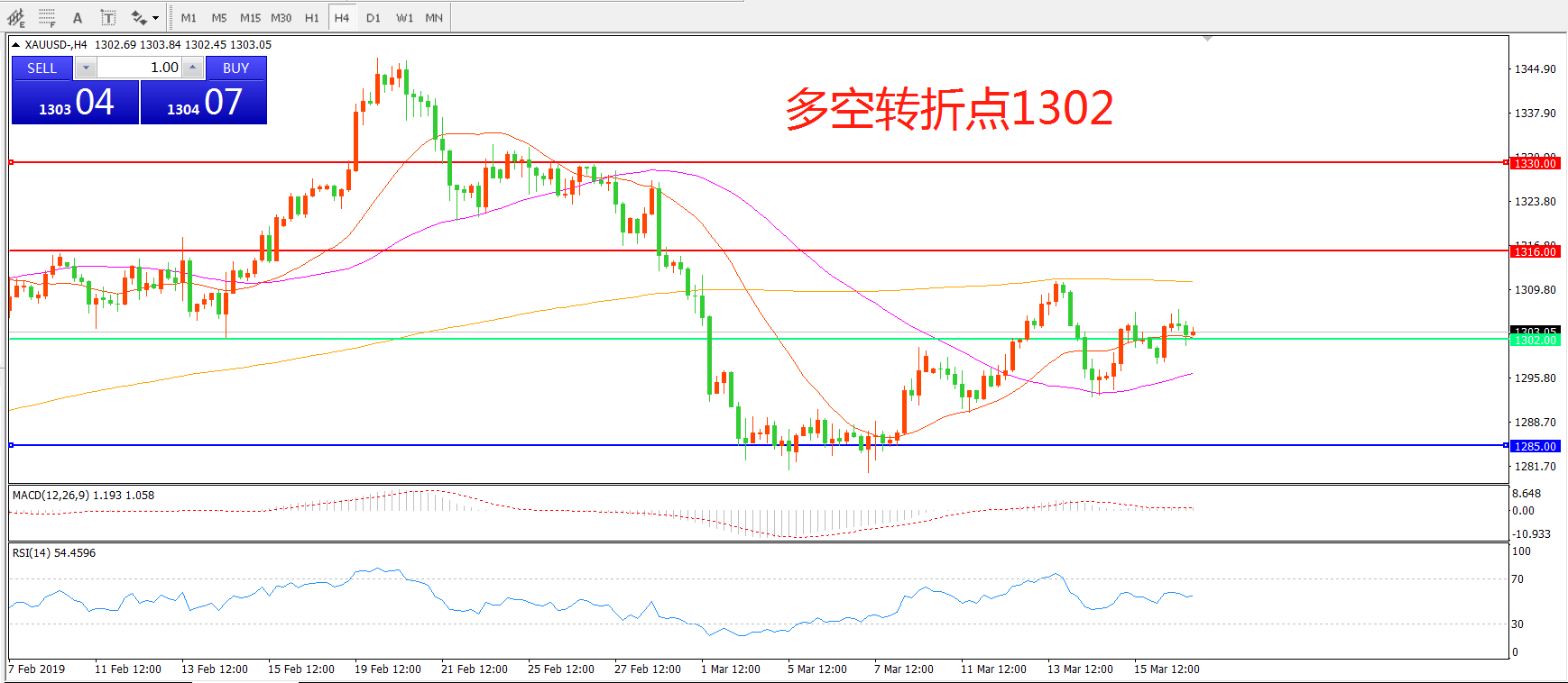 本周市场重点关注美联储与英国央行3月决议,投资者提前押注美联储本周宽松立场,使得美元相对走软,金价回升。同时近期报道中关于脱欧及新西兰发生的地缘事件使得市场对英国及新西兰地区经济增长持有担忧。在中美贸易事件上,虽然新华社近日消息称,中美双方更为接近达成协议,但中美领导人4月会面事件发生的概率在降低,引发黄金部分买盘需求,助长了多头升破千三的攻势。