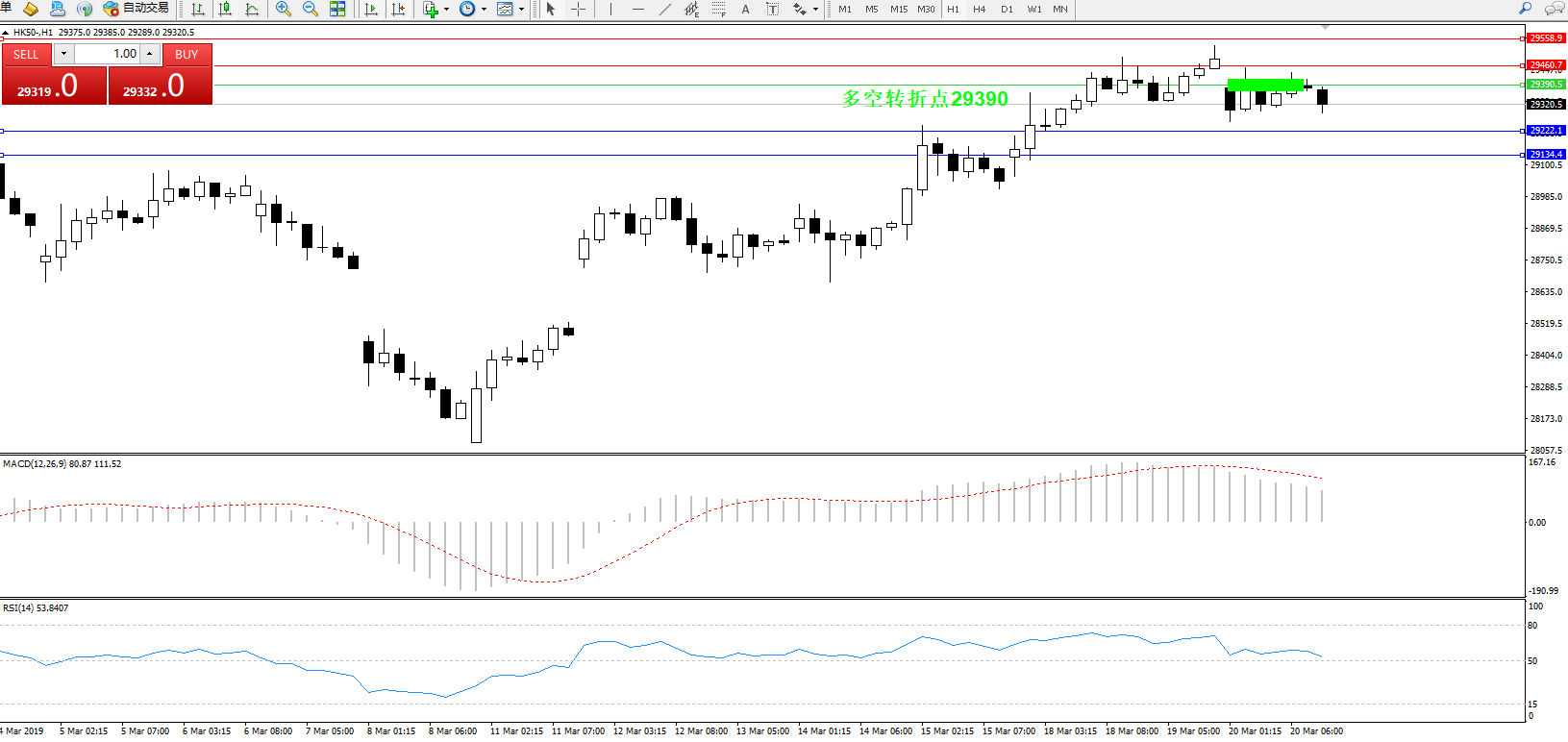 香港恒生指数收盘跌0.5%29320.97点,权重蓝筹股业绩前后的炒作暂时是最大的助力,另外A股以及美股走势仍是高位震荡向上,亦助恒指升情未完。板块方面,软件、产业信托及内房股似有接力炒作的现象,可留意相关股份公布业绩前后股价表现。美联储利率决议按兵不动,下调利率“点阵图”、下修经济增长与通胀预期,宣布将逐步停止“缩表”,政策鸽派程度高于预期。
