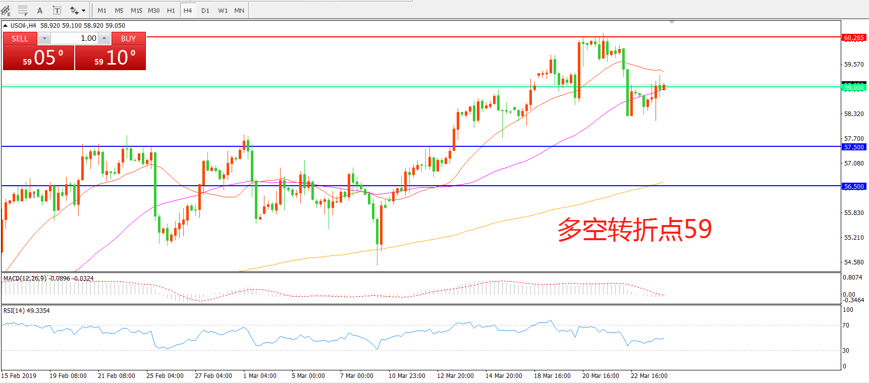 周一(3月25日)全球负利率债券名义值超过10亿美元,上周五德国10年期国债收益率近两年半来首次跌为负,美国3个月和10年期国债的息差2007年以来首次倒挂。风起云涌的忧虑情绪打压了风险资产价格。WTI原油收跌0.22美元,报58.82美元/桶。