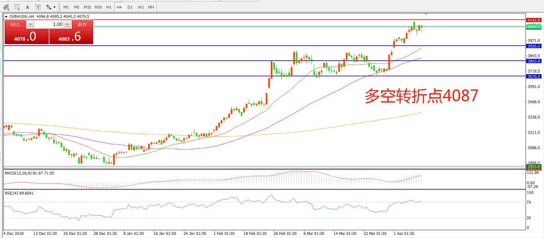 4小时图看,中华指数阳线连续拉升,昨日一度接近4142后出现回落,整体依然偏多,但调整成为可能。 MACD红柱增加,RSI指标拐头,多头趋势依然明显,延续上升概率较大。