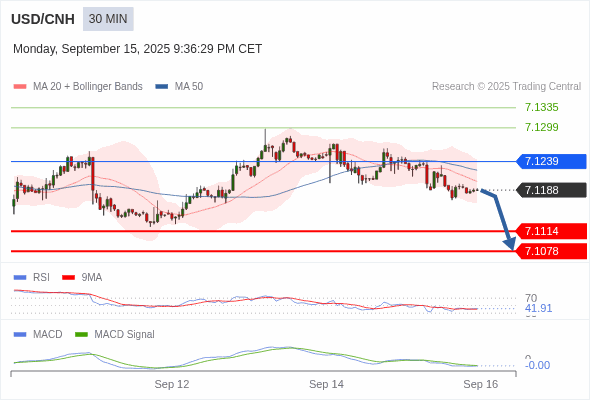 美元/人民币 当日内 : 看跌,在 7.1239 之下。