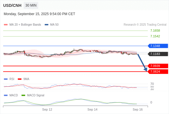 备选策略: 如突破 7.1348 ,USD/CNH 目标方向为 7.1542 和 7.1658 。