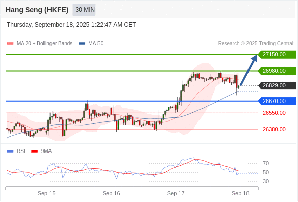 香港恒生指数期货 当日内: 在26670.00之上,看涨。