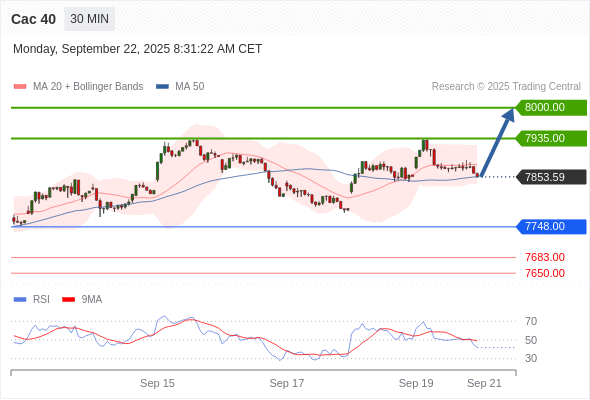 Cac 40 当日内: 在7748.00之上,看涨。