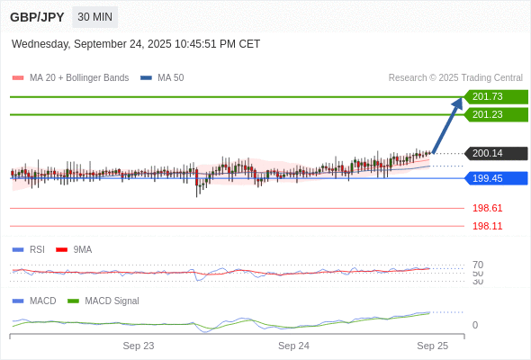 备选策略: 如跌破 199.45 ,GBP/JPY 目标方向定在 198.61 和 198.11 。