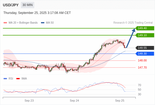 在 148.30 之上,看涨,目标价位为 149.10 ,然后为 149.40 。