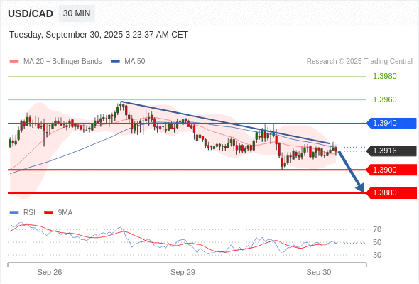 在 1.3940 之下,看跌,目标价位为 1.3900 ,然后为 1.3880 。