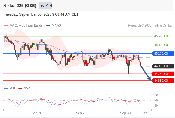 在 45180.00 之下,看跌,目标价位为 44780.00 ,然后为 44650.00 。