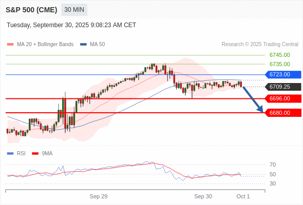 在 6723.00 之下,看跌,目标价位为 6696.00 ,然后为 6680.00 。