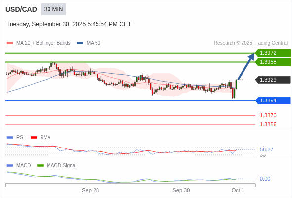 美元/加元 当日内 : 看涨,当 1.3894 为支撑位。