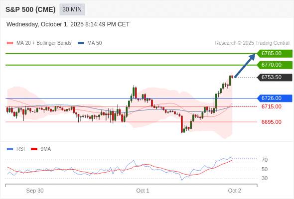 在 6726.00 之上,看涨,目标价位为 6770.00 ,然后为 6785.00 。