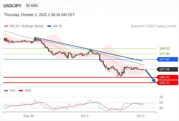 在 147.60 之下,看跌,目标价位为 146.60 ,然后为 146.30 。