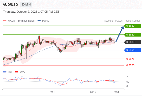 在 0.6595 之上,看涨,目标价位为 0.6630 ,然后为 0.6650 。