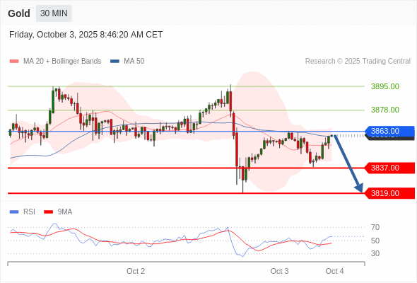 黄金现货 当日内: 短期关键阻力位在3863.00。