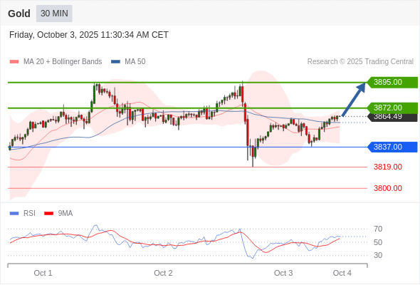 在 3837.00 之上,看涨,目标价位为 3872.00 ,然后为 3895.00 。