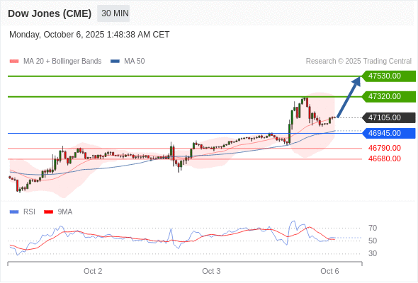 在 46945.00 之上,看涨,目标价位为 47320.00 ,然后为 47530.00 。