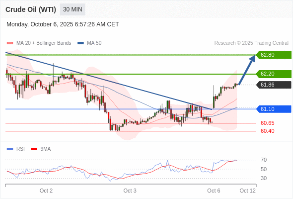 在 61.10 之上,看涨,目标价位为 62.20 ,然后为 62.80 。