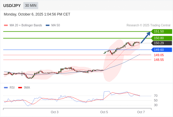 在 149.60 之上,看涨,目标价位为 150.80 ,然后为 151.50 。
