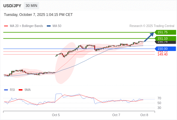 在 150.00 之上,看涨,目标价位为 151.10 ,然后为 151.75 。