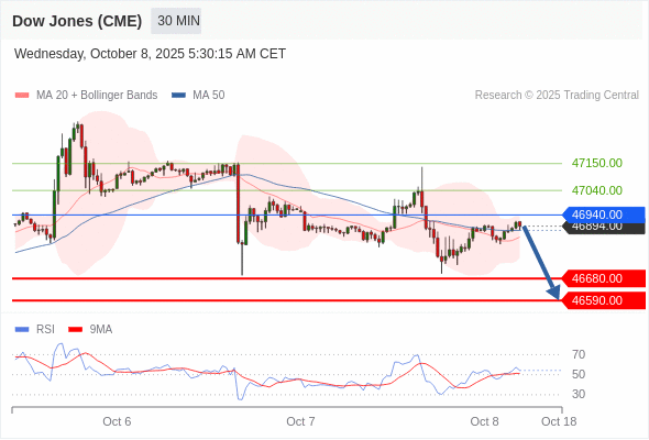 在 46940.00 之下,看跌,目标价位为 46680.00 ,然后为 46590.00 。