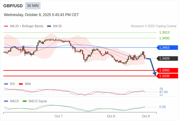英镑/美元 当日内 : 当 1.3453 维持阻力位时,存在回归 1.3338 的风险。