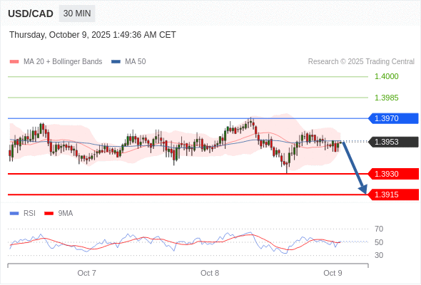 在 1.3970 之下,看跌,目标价位为 1.3930 ,然后为 1.3915 。
