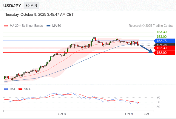 在 152.75 之下,看跌,目标价位为 152.30 ,然后为 152.00 。