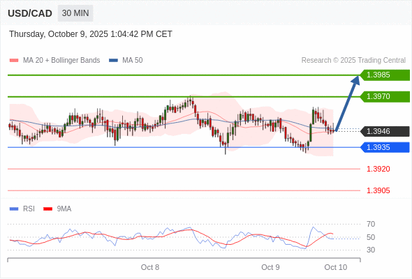 在 1.3935 之上,看涨,目标价位为 1.3970 ,然后为 1.3985 。
