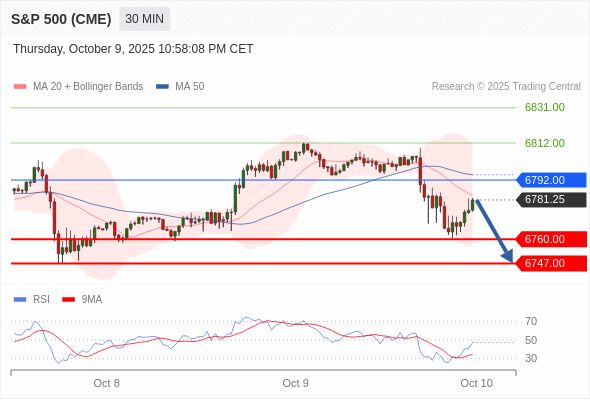 美国标普500指数期货 (Z5) 当日内: 短期关键阻力位在6792.00。