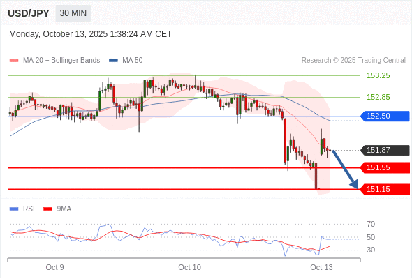 在 152.50 之下,看跌,目标价位为 151.55 ,然后为 151.15 。