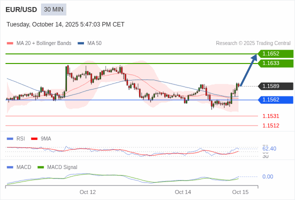 欧元/美元 当日内 : 看涨,当 1.1562 为支撑位。