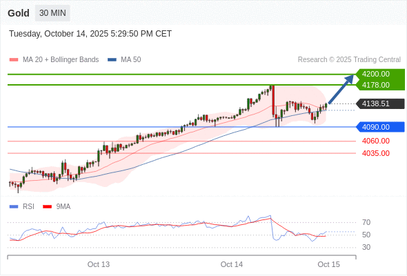 在 4090.00 之上,看涨,目标价位为 4178.00 ,然后为 4200.00 。