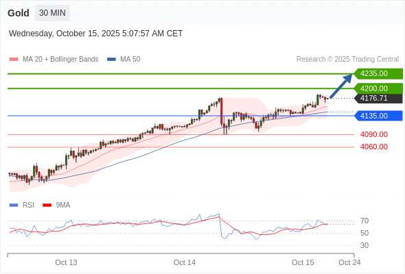 在 4135.00 之上,看涨,目标价位为 4200.00 ,然后为 4235.00 。