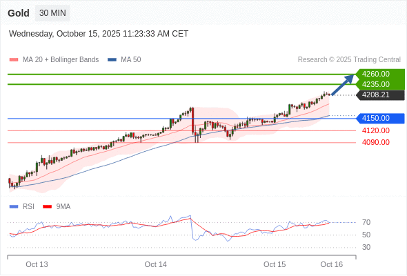 在 4150.00 之上,看涨,目标价位为 4235.00 ,然后为 4260.00 。
