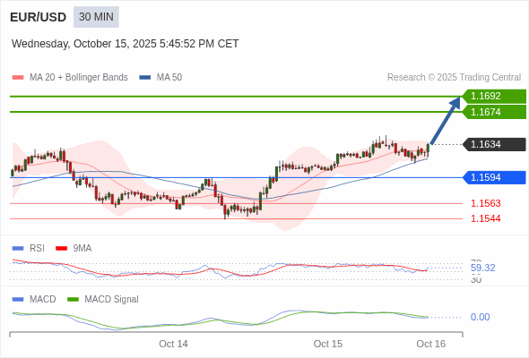 欧元/美元 当日内 : 看涨,当 1.1594 为支撑位,目标定在1.1692。