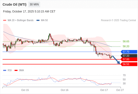 美国原油 (WTI) 期货 (X5) 当日内: 短期关键阻力位在57.70。