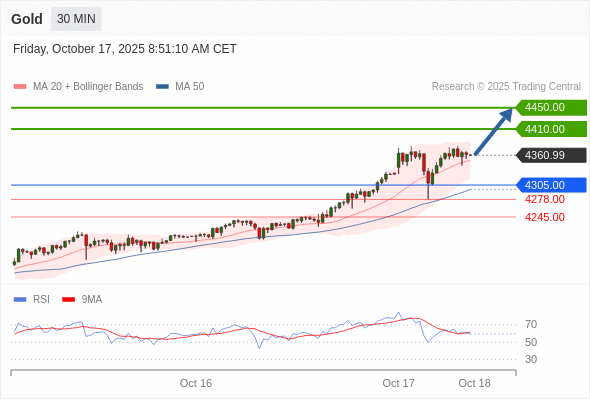 在 4305.00 之上,看涨,目标价位为 4410.00 ,然后为 4450.00 。