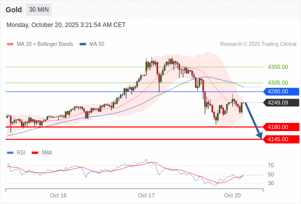 交易策略: 在 4280.00 之下,看跌,目标价位为 4180.00 ,然后为 4145.00 。