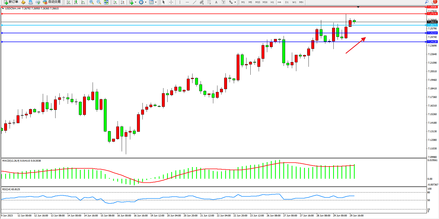 交易策略:7.26171上方看涨,目标7.27576 7.28406