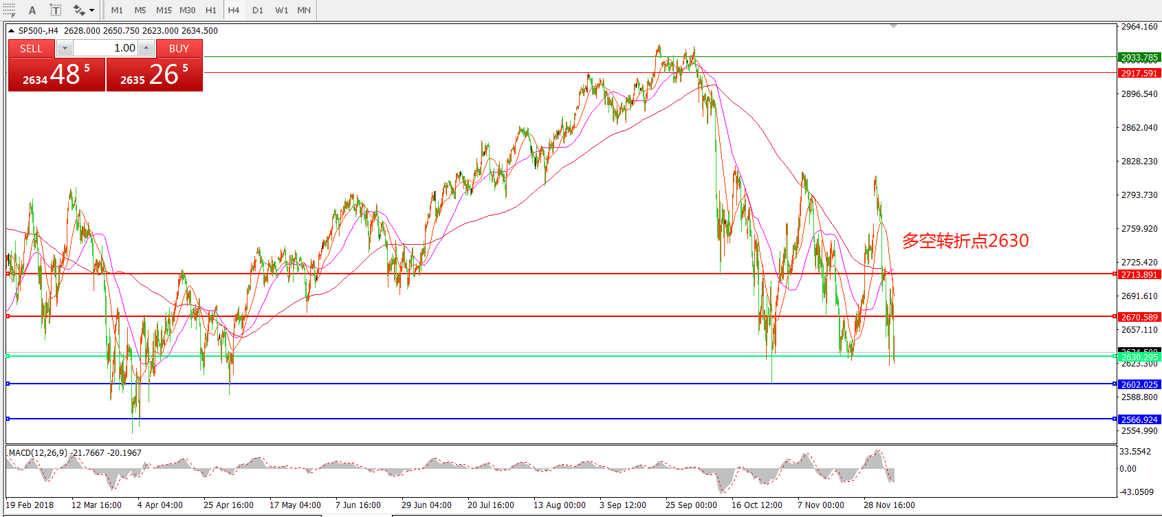 4小时图看,标普500连续下破关键支撑,整体价格直接跌至均线系统之下, MACD绿柱增加,短期震荡下行的概率较大。
