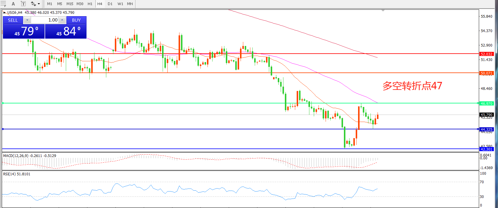 4小时图看,油价触及42美金后出现反弹,均线系统仍呈空头排列,MACD绿柱缩短,短期走势呈现回落震荡的概率较大。