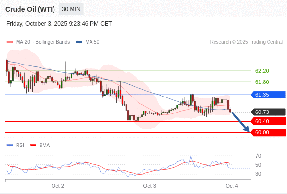 交易策略: 在 61.35 之下,看跌,目标价位为 60.40 ,然后为 60.00 。