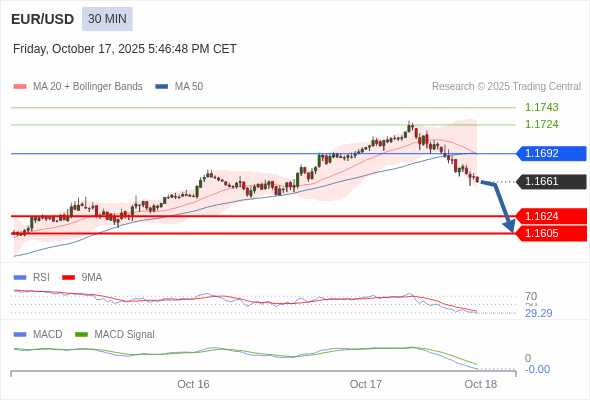 欧元/美元 当日内 : 看跌,在 1.1692 之下。